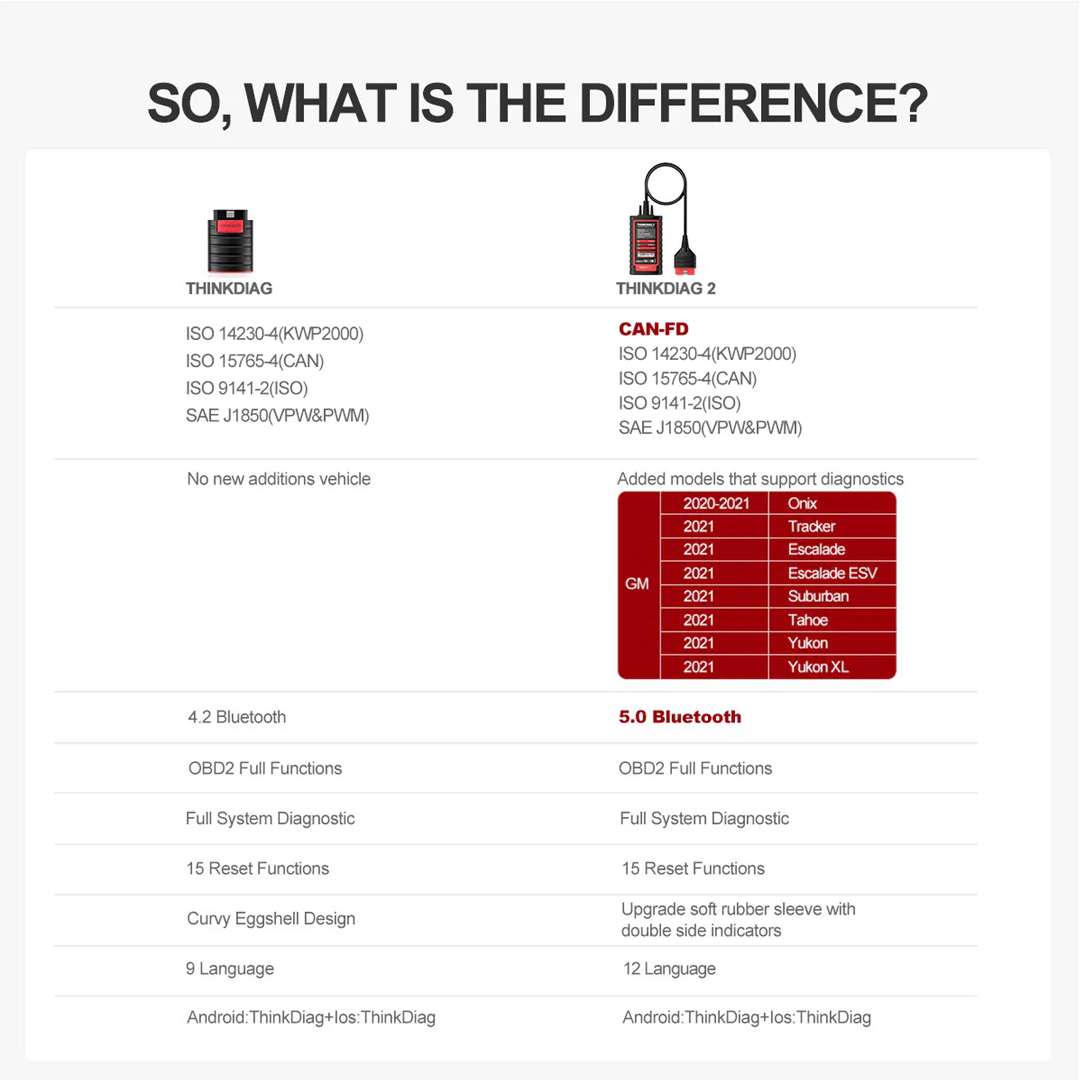 The most significant difference between thinkdiag and thinkdiag2 is CAN FD protocols. Thinkdiag2 has a built-in CAN FD protocol. It is the only product in this price range that is compatible with CAN-FD protocol and supports the latest GM vehicles manufactured after 2020. Adopts advanced CRC algorithms to accommodate more data from 8 to 64 bytes in the CAN frame, which runs faster than other products, and reduces the risk of undetected errors to enhance the user experience significantly.